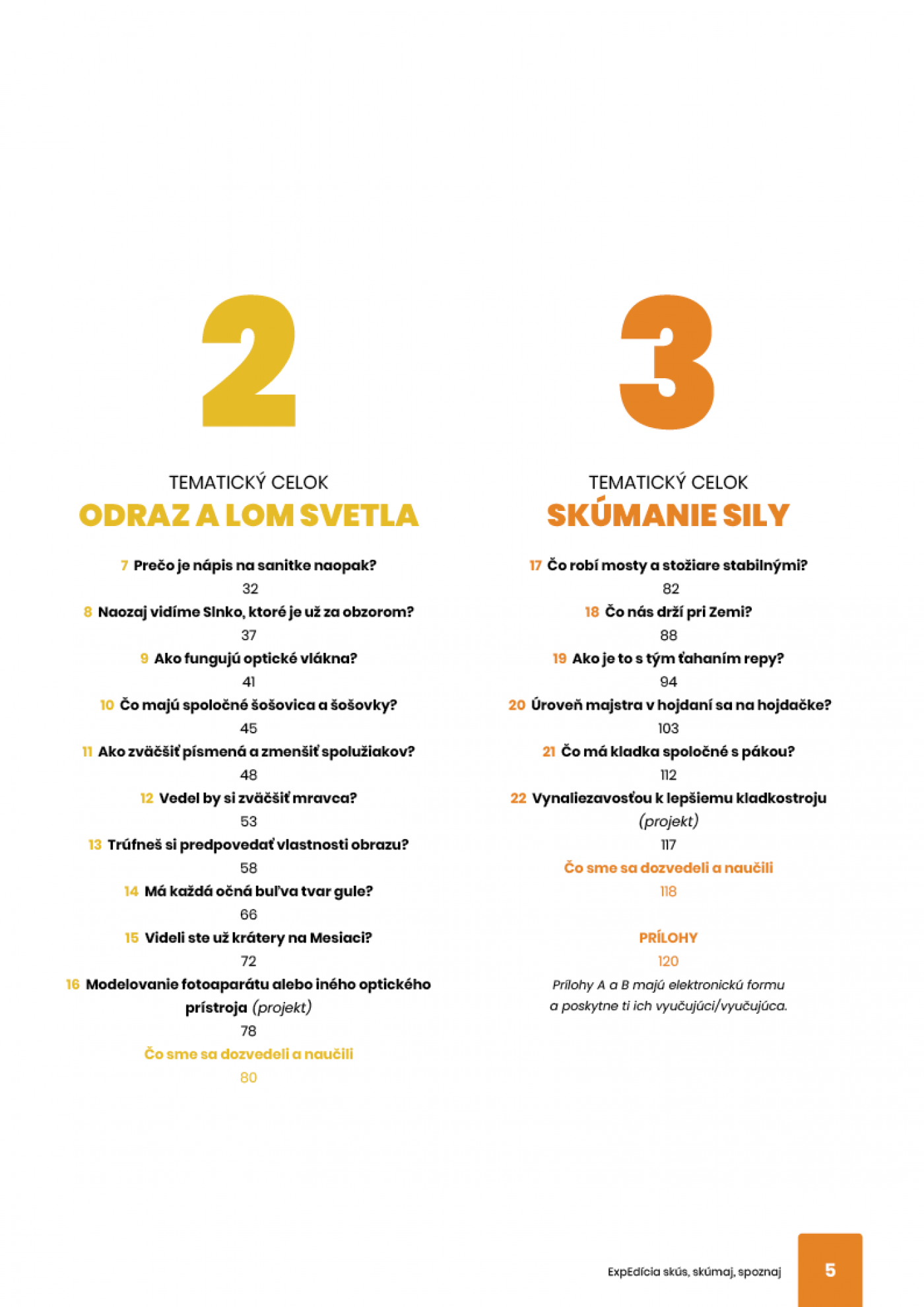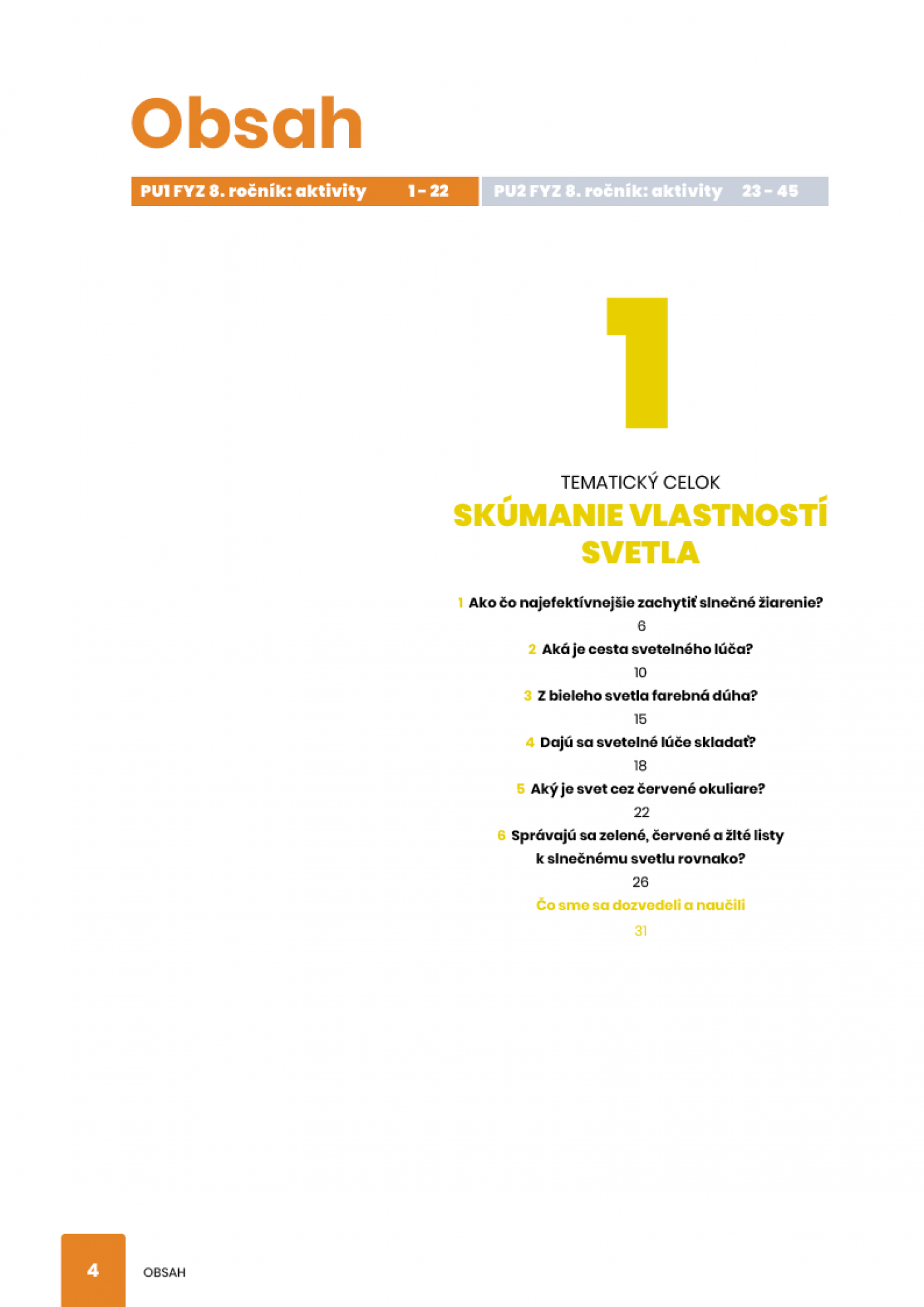 Pracovná učebnica ponúka 22 výskumne ladených aktivít vrátane práce na projekte, ktoré podporujú induktívny poznávací proces detí. Žiaci riešia výskumné problémy ako napríklad Ako čo najefektívnejšie zachytiť slnečné žiarenie?, tiež skúmajú Aký je svet cez červené okuliare?, hľadajú odpovede na otázky Prečo je nápis na sanitke naopak? alebo Má každá očná buľva tvar gule?, zisťujú Čo nás drží pri Zemi? a tiež pracujú na projektoch ako napríklad Vynaliezavosťou k lepšiemu kladkostroju.