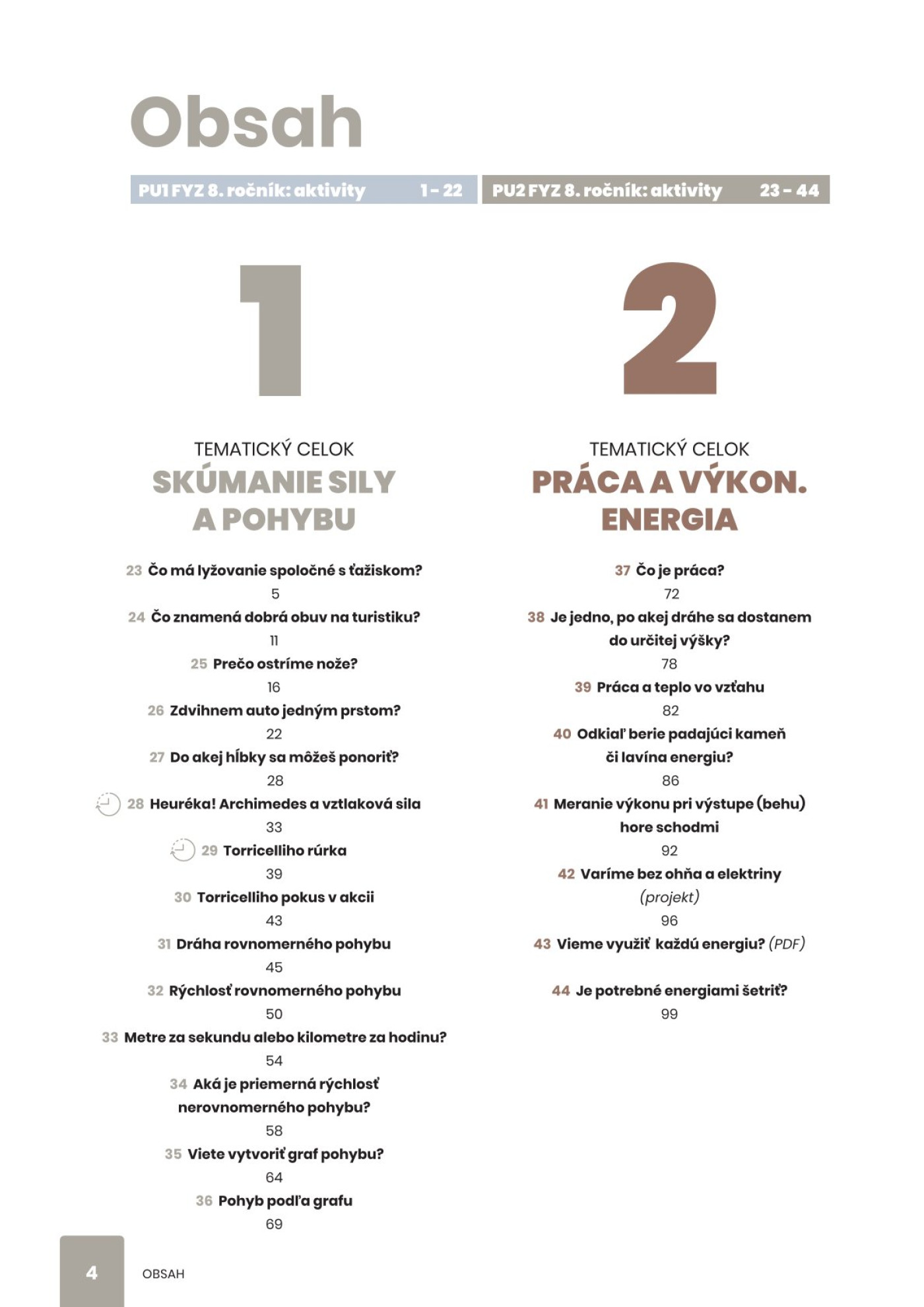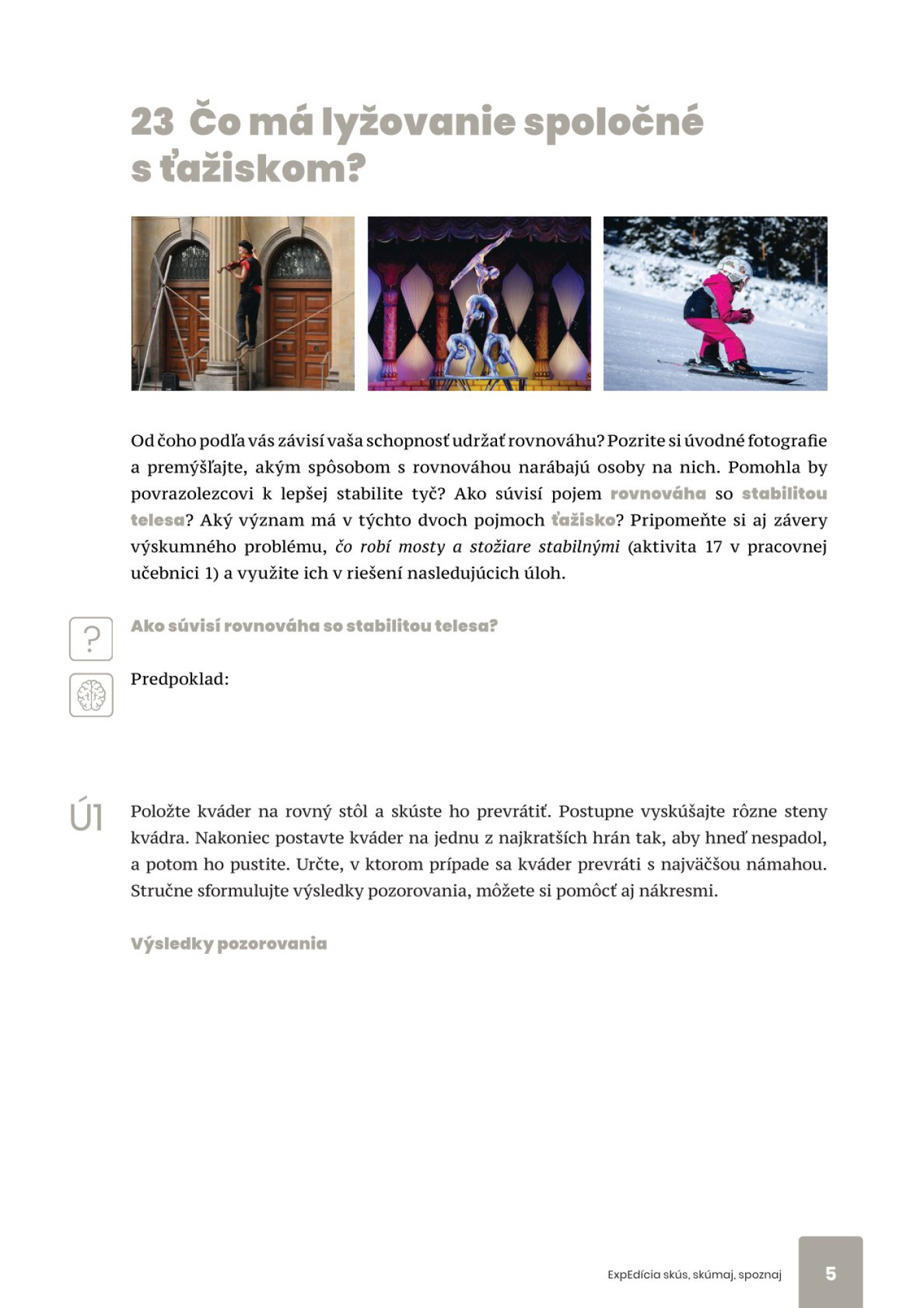 Pracovná učebnica ponúka 22 výskumne ladených aktivít vrátane práce na projekte, ktoré podporujú induktívny poznávací proces detí. Žiaci riešia výskumné problémy ako napríklad Čo má lyžovanie spoločné s ťažiskom?, tiež skúmajú Čo znamená dobrá obuv na turistiku?, hľadajú odpovede na otázky Do akej hĺbky sa môžeš ponoriť? alebo Odkiaľ berie padajúci kameň či lavína energiu? a tiež pracujú na projekte Varíme bez ohňa a elektriny.