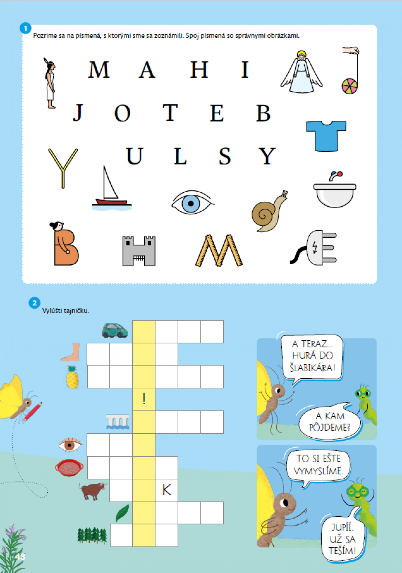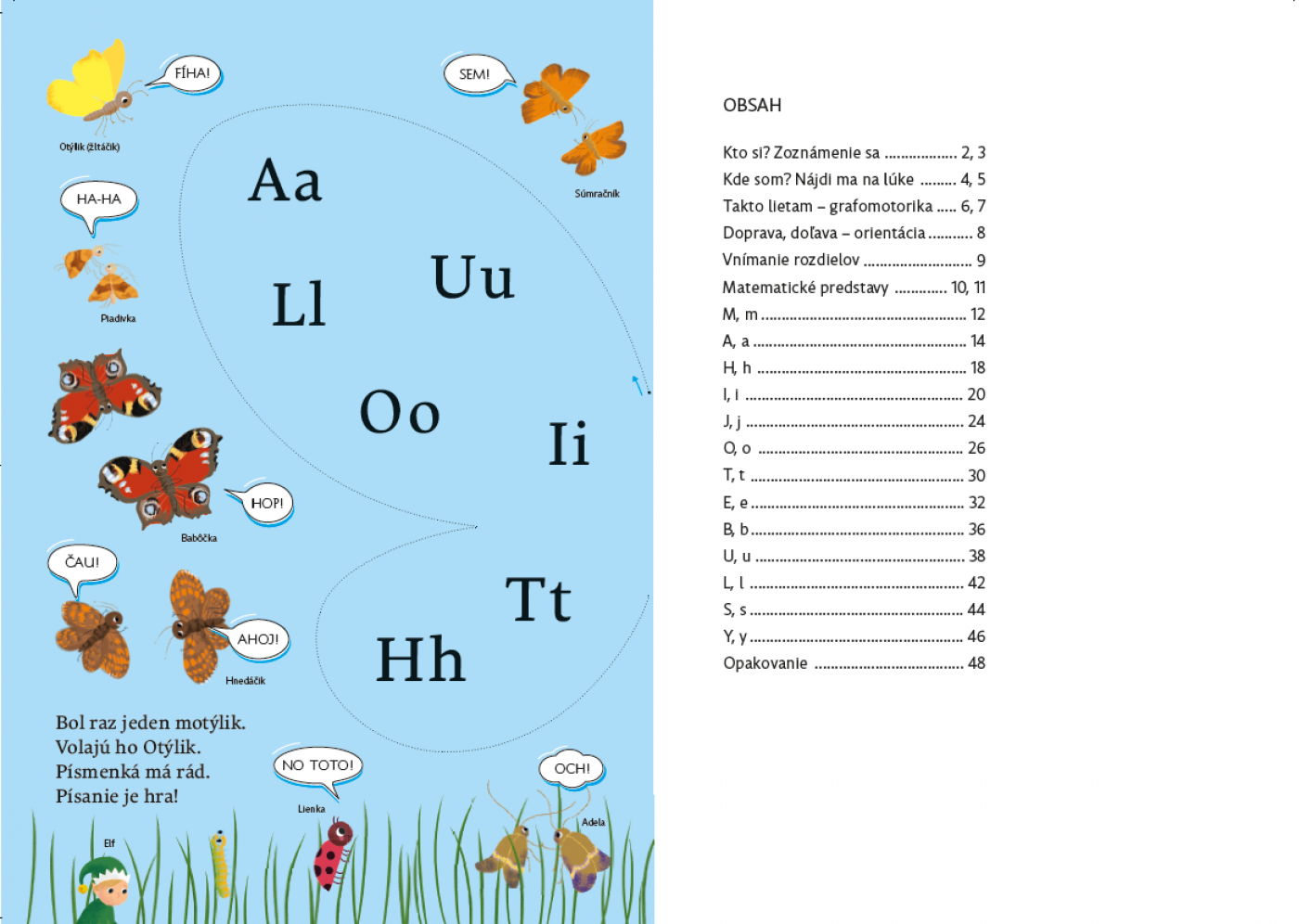 Cieľom publikácie je ponúknuť žiakom lákavú, ale prehľadnú učebnicu s jasne usporiadanou štruktúrou úloh a nevtieravou grafikovu. Vytvárať im pocit istoty pri plnení úloh, ale zároveň ich podnecovať a dodávať im odvahu k ďalšiemu poznávaniu. V učebnici vystupujú dve malé zvieratká - motýlik Otýlik a húsenička Jasenka, ktoré deti sprevádzajú celou publikáciou. Deti sa s nimi zoznámia hneď na začiatku učebnice. Komunikujú medzi sebou prostredníctvom komiksových bublín. Tie obsahujú krátke slová, citoslovcia alebo jednoduché vety.