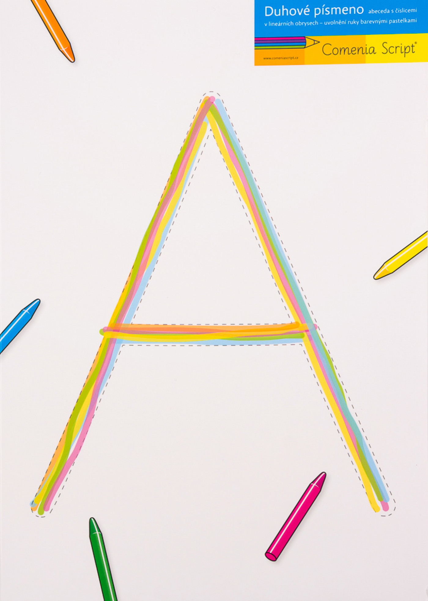 Sada Dúhové písmená obsahuje 66 listov veľkosti A4 s veľkou abecedou, malou abecedou a číslicami v lineárnych obrysoch.