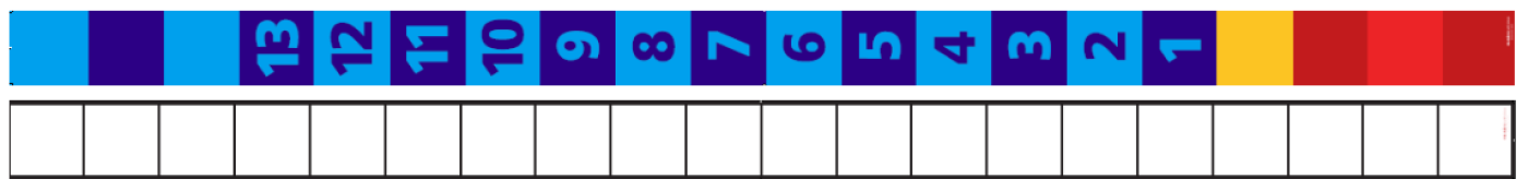 Krokovací pás pre Hejného metódu. Z jednej strany sú biele políčka bez čísel, z druhej strany farebná políčka s číslami (Schody).