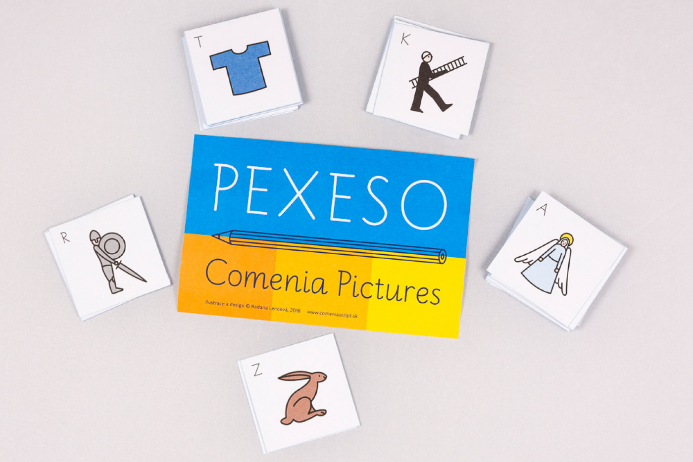 Obľúbená pamäťová hra pre deti a dospelých. Slúži na ľahšie zapamätantie si abecedy. Obsahuje písmena a obrázkovú abecedu „Comenia Pictures“.